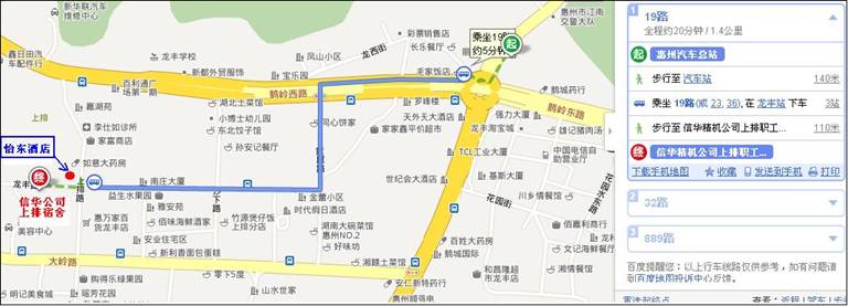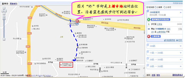 从惠州汽车站到上排职工宿舍的位置路线图请参考下图: